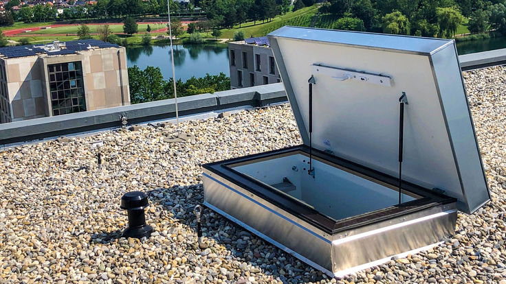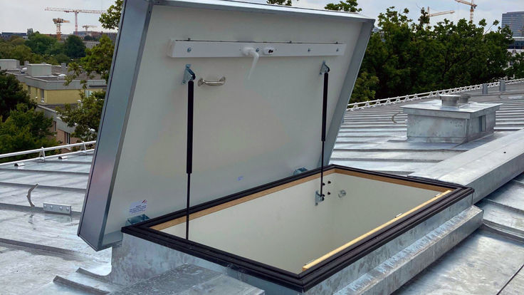 Mit Flachdachausstiegen von Roto sind Arbeitseinsätze auf dem Dach einfacher und sicherer erreichbar – und die Optik von Gebäuden wird nicht mehr durch Geländer und Treppenaufgänge beeinflusst. Für Wartungs- und Reparaturarbeiten nutzen Servicetechniker nun einfach den Weg durch das Gebäude, öffnen die Luke des Flachdachaufstiegs, ziehen die innenliegende Leiter heraus – und steigen sicher und komfortabel aufs Dach.