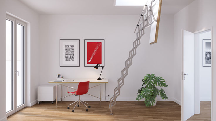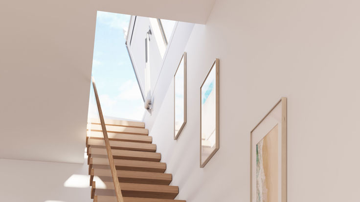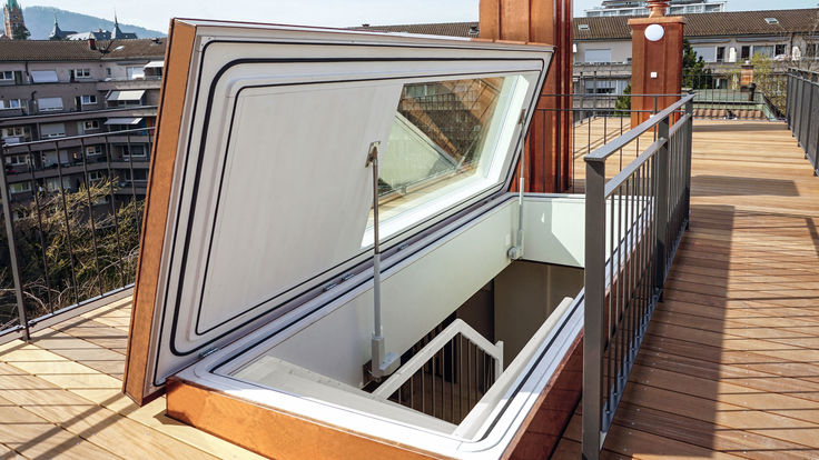 Insbesondere in urbanen Räumen, die dicht besiedelt sind und nur wenig Raum für einen Garten lassen, sind Dachterrassen eine zunehmend nachgefragte Lösung. Dabei gilt es, auch einen ansprechenden und sicheren Aufstieg zu schaffen. Der Roto Terrassenausstieg öffnet auf Knopfdruck den Zugang zum Dach, der über eine konventionelle Treppe sicher und bequem gelingt.