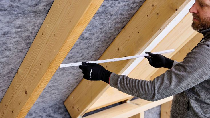 Der flexible „Dämmkeil Next“ wird einfach mit einem Übermaß von 10 – 15 mm auf die Sparren- oder Ständerbreite zugeschnitten und in die Konstruktion geklemmt. Der Verschnitt ist minimal. Durch die bereits werkseitig vorgeschnittene Keilform wird ein einfaches Verschieben der Dämmkeile zueinander möglich. Es entsteht eine fugenlose, homogene Dämmschicht. Einmal mit etwas Druck zwischen die Sparren geklemmt, bleiben die stabilen, aber elastisch federnden Keile zuverlässig an ihrer Position. Diese einfache Verarbeitung hat den Dämmkeil über Jahrzehnte bei den Innenausbaugewerken und Bauherren so beliebt gemacht.